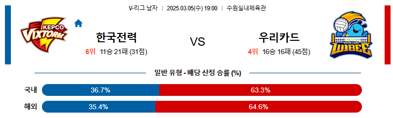 한국전력 대 우리카드 V리그 03월05일 맞대결 생중계, 스포츠중계, 스포츠분석