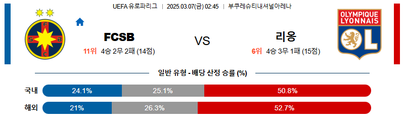 FCSB 대 리옹 UEFA유로파리그 03월07일 맞대결 생중계, 스포츠중계, 스포츠분석