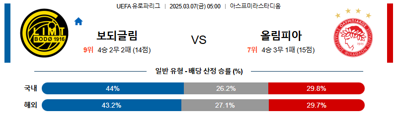 보되글림트 대 올림피아코스 UEFA유로파리그 03월07일 맞대결 생중계, 스포츠중계, 스포츠분석