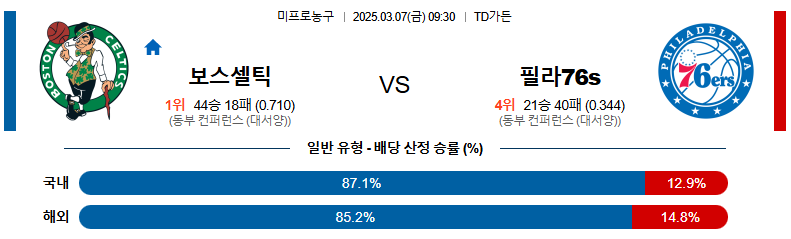 보스턴 셀틱스의 승리를 추천드립니다. 다만, 핸디캡 승부에서는 필라델피아의 가능성을 고려해야 할 기준점이 있습니다.