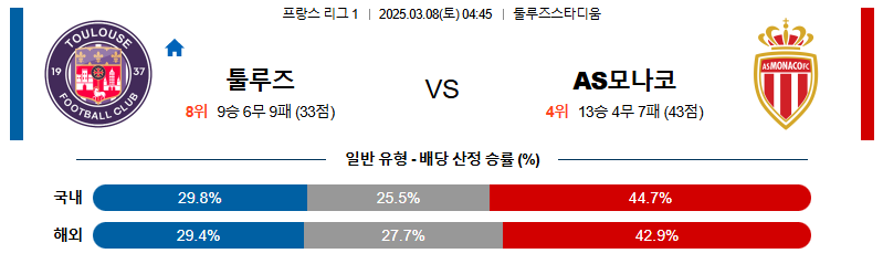 툴루즈 대 모나코 리그앙 03월08일 맞대결 생중계, 스포츠중계, 스포츠분석