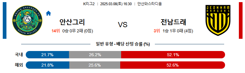 안산 대 전남 K리그2 03월08일 맞대결 생중계, 스포츠중계, 스포츠분석