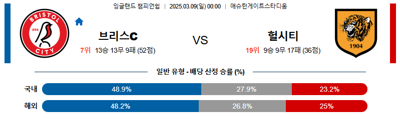 브리스톨 대 헐시티 잉글랜드챔피언쉽 03월09일 맞대결 생중계, 스포츠중계, 스포츠분석