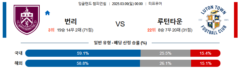 번리는 지난 FA컵 5라운드에서 프레스턴에게 0-3으로 패하며 대회를 마감했지만, 챔피언십에서는 여전히 강력한 승격 후보로 자리하고 있습니다. 주중 카디프시티 원정에서 2-1 승리를 거두며 리그 무패 행진을 22경기로 늘렸고, 2위 셰필드유나이티드와의 격차를 2점 차로 유지하고 있습니다. 조쉬 브라운힐과 막심 에스테베가 득점하며 공격력이 살아났고, 후반전 실점 이후에도 안정적인 경기 운영을 선보였습니다. 특히 번리는 홈 경기에서 강한 모습을 보이고 있으며, 이번 경기에서도 승리한다면 리그 홈 4연승을 기록하게 됩니다. 루턴타운과의 맞대결에서도 최근 9경기 무패를 기록 중이며, 시즌 초반 원정 경기에서도 4-1 대승을 거둔 바 있습니다. 다만 이번 경기에서 조던 베이어, 아론 램지, 마이크 트레조르가 부상으로 결장하며, 첼시에서 임대 온 바시르 험프리스도 네 경기 연속 결장이 예상됩니다. 그러나 최근 경기력과 홈 경기의 강점을 고려했을 때, 스콧 파커 감독의 팀은 다시 한번 안정적인 경기 운영을 통해 승리를 노릴 것입니다.