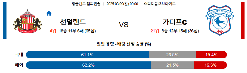 선더랜드 대 카디프시티 잉글랜드챔피언쉽 03월09일 맞대결 생중계, 스포츠중계, 스포츠분석