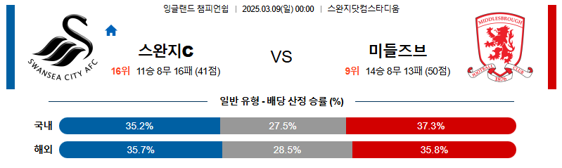스완지 대 미들즈브러 잉글랜드챔피언쉽 03월09일 맞대결 생중계, 스포츠중계, 스포츠분석