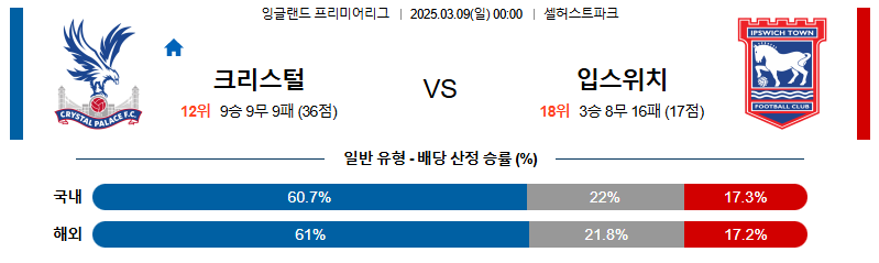 크리스탈 대 입스위치 프리미어리그 03월09일 맞대결 생중계, 스포츠중계, 스포츠분석