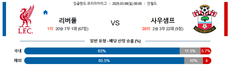 리버풀 대 사우샘프턴 프리미어리그 03월09일 맞대결 생중계, 스포츠중계, 스포츠분석