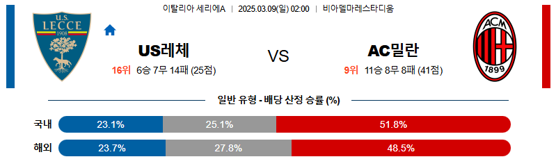 레체 대 AC밀란 세리에A 03월09일 맞대결 생중계, 스포츠중계, 스포츠분석