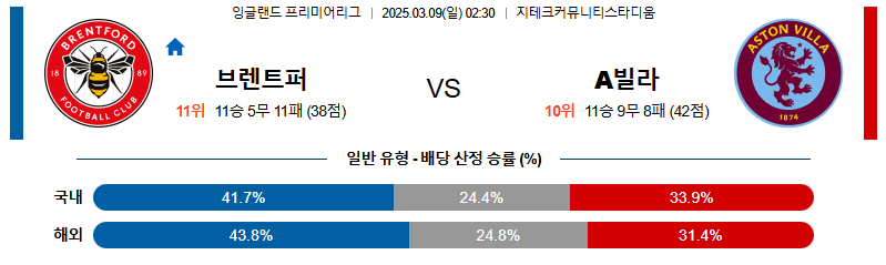 브랜트포드 대 아스톤빌라 프리미어리그 03월09일 맞대결 생중계, 스포츠중계, 스포츠분석