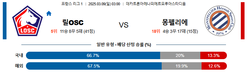 릴 대 몽펠리에 리그앙 03월09일 맞대결 생중계, 스포츠중계, 스포츠분석