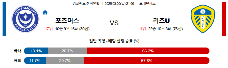 포츠머스 대 리즈 잉글랜드챔피언쉽 03월09일 맞대결 생중계, 스포츠중계, 스포츠분석