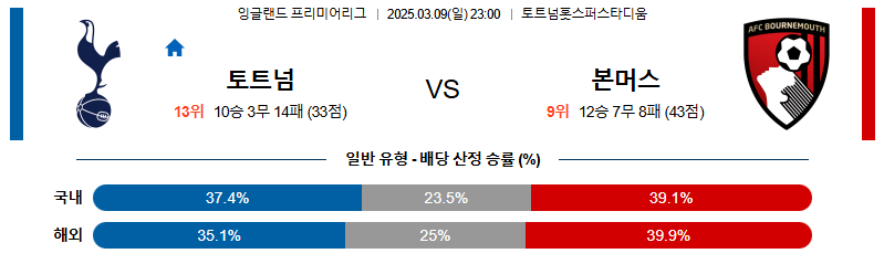 토트넘 대 본머스 프리미어리그 03월09일 맞대결 생중계, 스포츠중계, 스포츠분석