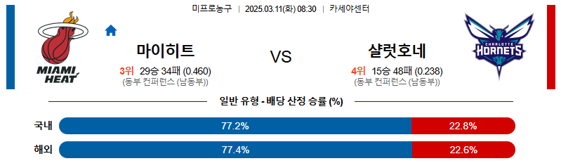 마이애미 대 샬럿 NBA 03월11일 맞대결 생중계, 스포츠중계, 스포츠분석