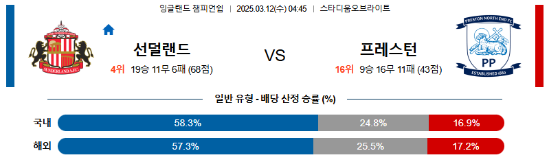 선덜랜드 대 프레스턴 잉글랜드챔피언쉽 03월12일 맞대결 생중계, 스포츠중계, 스포츠분석