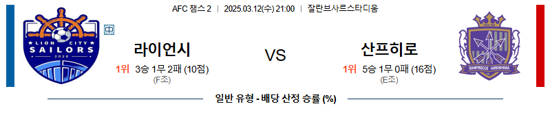 라이언시티 대 산프레체히로시마 AFC챔피언스리그2 03월12일 맞대결 생중계, 스포츠중계, 스포츠분석