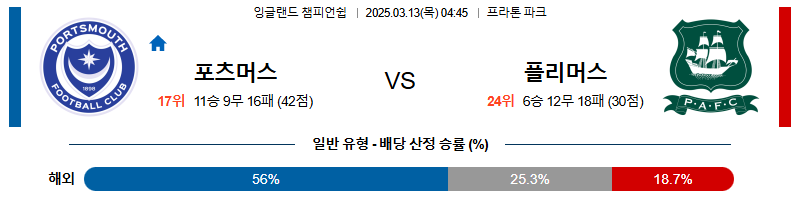 포츠머스 대 플리머스 잉글랜드챔피언쉽 03월13일 맞대결 생중계, 스포츠중계, 스포츠분석