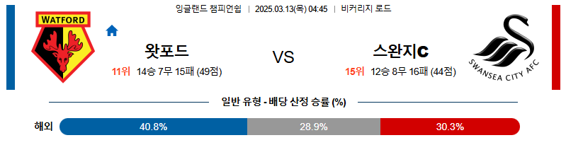 왓포드 대 스완지시티 잉글랜드챔피언쉽 03월13일 맞대결 생중계, 스포츠중계, 스포츠분석