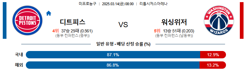 디트로이트 피스톤스 승리가 가능성이 높으며, 배당을 노리는 선택으로는 워싱턴 위저즈 핸디캡 승리를 고려할 수 있습니다.