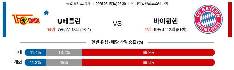 우니온베를린 대 바이에른뮌헨 분데스리가 03월15일 맞대결 생중계, 스포츠중계, 스포츠분석