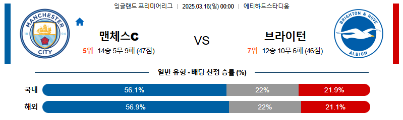 맨체스터시티 대 브라이튼 프리미어리그 03월16일 맞대결 생중계, 스포츠중계, 스포츠분석