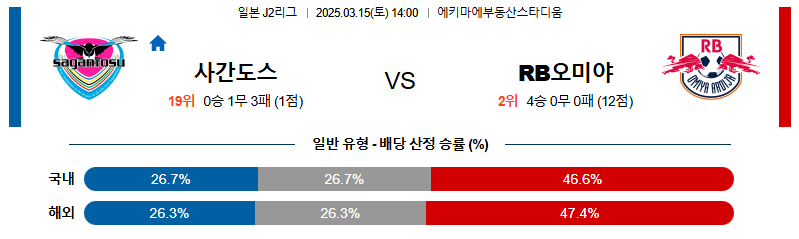 사간도스 대 오미야 J리그2 03월15일 맞대결 생중계, 스포츠중계, 스포츠분석