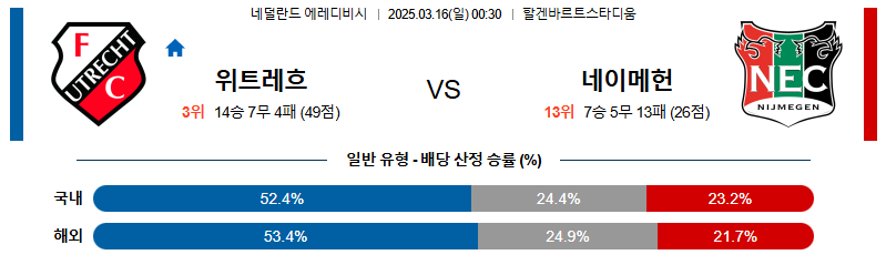 위트레흐트 대 네이메헌 에레디비지에 03월16일 맞대결 생중계, 스포츠중계, 스포츠분석