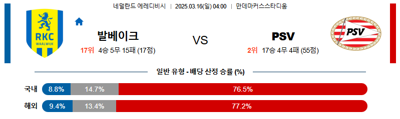 발베이크 대 PSV아인트호벤 에레디비지에 03월16일 맞대결 생중계, 스포츠중계, 스포츠분석
