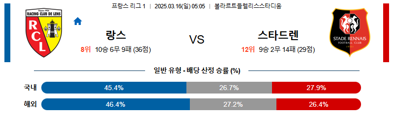 랑스 대 스타드렌 리그앙 03월16일 맞대결 생중계, 스포츠중계, 스포츠분석