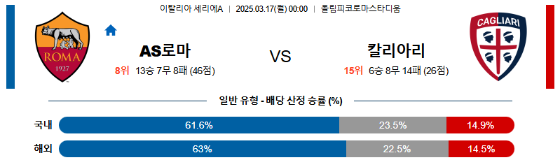 로마 대 칼리아리 세리에A 03월17일 맞대결 생중계, 스포츠중계, 스포츠분석