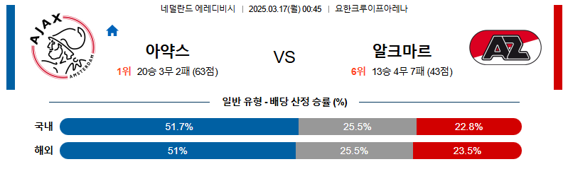 아약스 대 AZ알크마르 에레디비지에 03월17일 맞대결 생중계, 스포츠중계, 스포츠분석