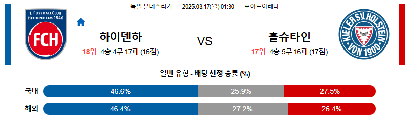 하이덴하임 대 홀슈타인킬 분데스리가 03월17일 맞대결 생중계, 스포츠중계, 스포츠분석