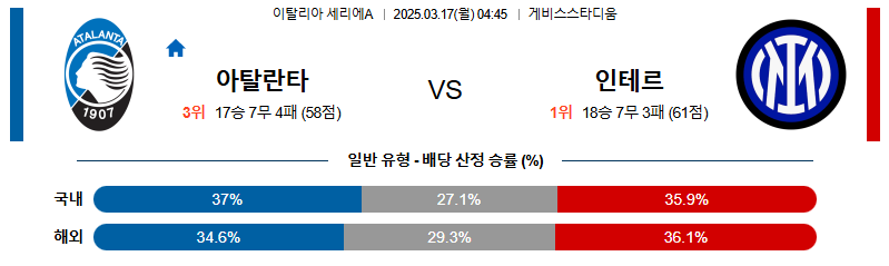 아탈란타 대 인터밀란 세리에A 03월17일 맞대결 생중계, 스포츠중계, 스포츠분석