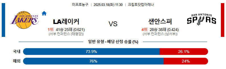 LA레이커스 대 샌안토니오 NBA 03월18일 맞대결 생중계, 스포츠중계, 스포츠분석