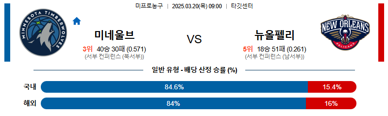 미네소타 팀버울브스가 승리할 가능성이 높습니다. 그러나 핸디캡 승부에서는 외곽슛 위주의 게임 플랜을 설계할 수 있는 뉴올리언스의 전력을 고려해야 합니다.