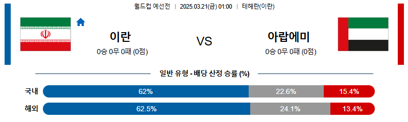 이란 승 / 오버(2.5 기준)를 예상합니다. 이란이 경기 주도권을 쥐고 일방적인 공세를 펼칠 가능성이 큽니다. 다만 UAE의 역습이 변수로 작용할 가능성이 있으며, UAE가 수비적으로 버티더라도 이란이 뚫어낼 가능성이 높습니다. 팽팽한 흐름보다는 이란의 승리가 유력하며, 한 골 차 이상의 승리를 예상합니다.