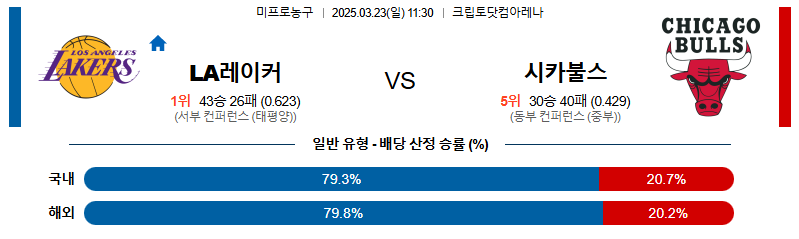LA 레이커스의 승리를 예상하며, 배당을 노리는 선택으로는 시카고 불스의 핸디캡 승리를 추천드립니다.