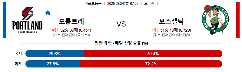 포틀랜드 대 보스턴 NBA 03월24일 맞대결 생중계, 스포츠중계, 스포츠분석