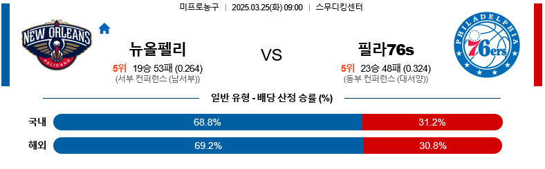 뉴올리언스 대 필라델피아 NBA 03월25일 맞대결 생중계, 스포츠중계, 스포츠분석