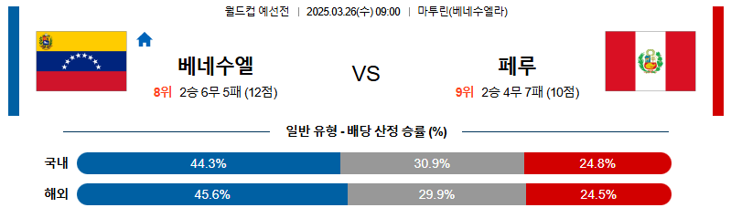 페루는 이전 경기에서 볼리비아를 상대로 3-1 승리를 거두며 분위기를 바꿨습니다. 오스카르 이바네스 감독이 부임 후 첫 경기에서 승리를 가져오며 팀의 사기를 높였고, 안디 폴로와 파올로 게레로, 에디손 플로레스 등 베테랑 자원들이 득점에 기여하며 안정감을 보였습니다. 원정 경기에서는 아직 득점이 없지만 이번 경기에서는 상승세를 바탕으로 보다 공격적으로 나설 가능성이 높습니다. 최근 베네수엘라를 상대로 8경기 연속 무패를 이어오고 있다는 점도 긍정적인 요소입니다.