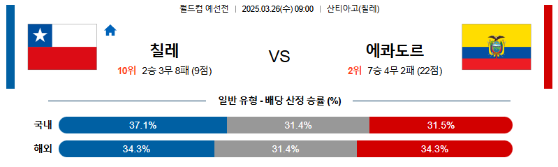 칠레는 현재 플레이오프 진출권 경쟁에서 생존하기 위해 남은 홈경기 세 경기에서 모두 승리를 거둬야 하는 상황입니다. 그러나 이번 경기는 최근 쉽게 무너지지 않는 에콰도르를 상대로 치러야 하므로 어려운 일정이 될 것으로 보입니다. 이전 경기에서 불안한 수비와 부족한 결정력을 드러낸 바 있으며, 주요 선수들의 잇따른 부상과 출전 정지로 인해 전력 공백이 발생한 상태입니다. 특히 후방 조직력이 흔들리고 있어 상대의 역습에 취약할 가능성이 높습니다. 최근 홈 경기에서 기대 이하의 경기력을 보였다는 점도 불안 요소로 작용할 전망입니다.