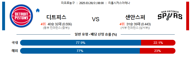 디트로이트 대 샌안토니오 NBA 03월26일 맞대결 생중계, 스포츠중계, 스포츠분석