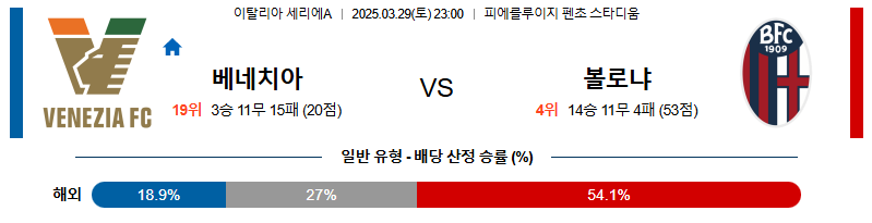 베네치아 대 볼로냐 세리에A 03월29일 맞대결 생중계, 스포츠중계, 스포츠분석