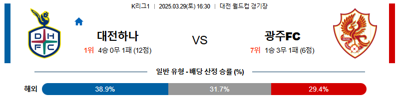 대전 대 광주 K리그1 03월29일 맞대결 생중계, 스포츠중계, 스포츠분석