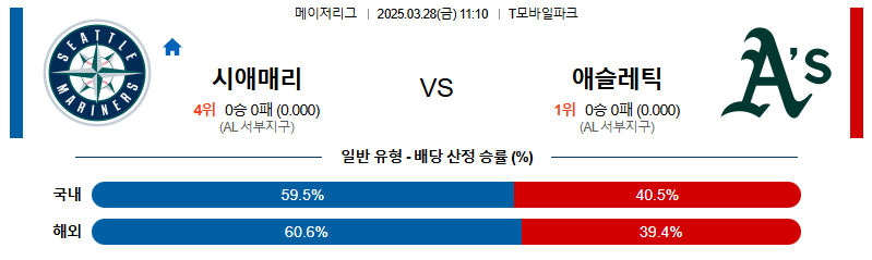 시애틀 대 애슬레틱스 MLB 03월28일 맞대결 생중계, 스포츠중계, 스포츠분석