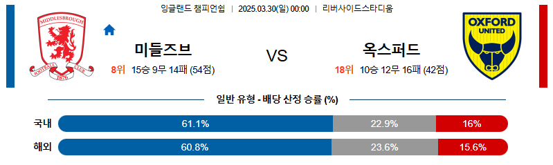 미들즈브러 대 옥스포드 잉글랜드챔피언쉽 03월30일 맞대결 생중계, 스포츠중계, 스포츠분석