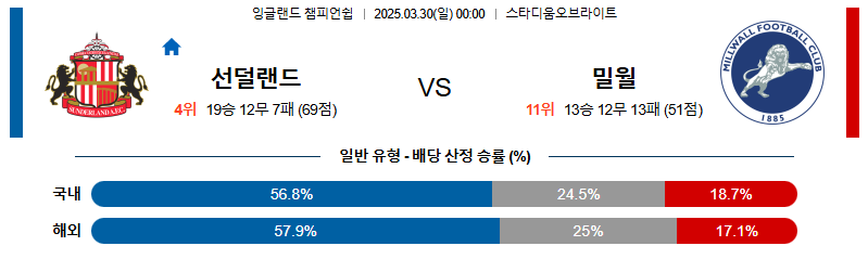 선더랜드 대 밀월 잉글랜드챔피언쉽 03월30일 맞대결 생중계, 스포츠중계, 스포츠분석