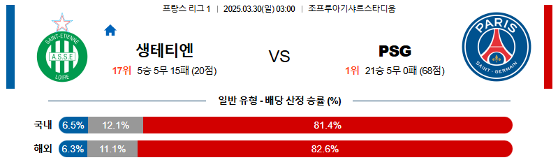 생테티엔은 최근 몽펠리에 원정 경기에서 2-0으로 앞서던 중 발생한 관중 소요로 인해 경기가 중단되었습니다. 리그 사무국의 결정에 따라 이 경기는 몰수승으로 인정될 가능성이 높아 보입니다. 승점 3점이 추가될 경우 생테티엔은 강등권에서 벗어나 랭스와 같은 승점이 되며 생존 경쟁에서 반등의 기회를 얻게 됩니다. 홈에서는 리그 17점 중 다수를 기록할 만큼 나름의 저력을 보여주었지만, 이번 경기는 상대가 너무 강합니다. 특히 이번 시즌 리그에서 전반전 실점이 가장 많은 팀이며, 전반 득점도 리그 최하위입니다. 수비에서 바투빈시카가 복귀하는 것은 반가운 소식이나, 무에페크와 보아키에의 출전 여부는 불투명하며, 공격진에서는 최근 3경기 4골을 넣은 스타신에게 의존하는 모습입니다.
