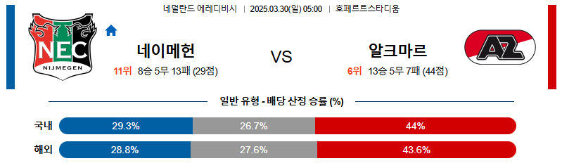 네이메헌 대 알크마르 에레디비지에 03월30일 맞대결 생중계, 스포츠중계, 스포츠분석
