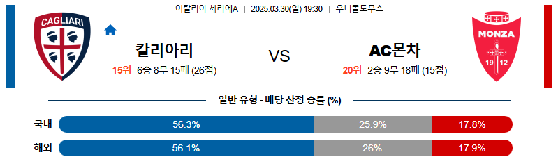 칼리아리 대 몬차 세리에A 03월30일 맞대결 생중계, 스포츠중계, 스포츠분석